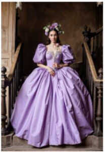 Depending on the level of the event, you may go with something more dramatic in detailing – like a ruffled collar, bishop sleeves or embroidered bodice. Matching the gown with modern accessories and hairstyles eschews the fashion sense as a mere costume, but a bold style that has an artistry of its own.